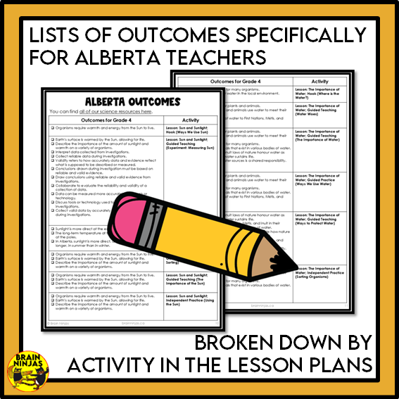 - an alignment guide for Alberta Outcomes in each resource broken down by activities in the lesson plan.