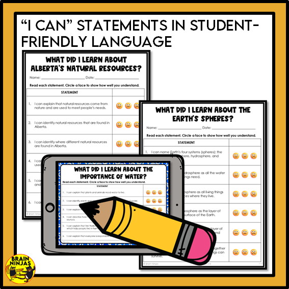 - "I can" statements in student-friendly language and format for students to self-assess their learning in each lesson.