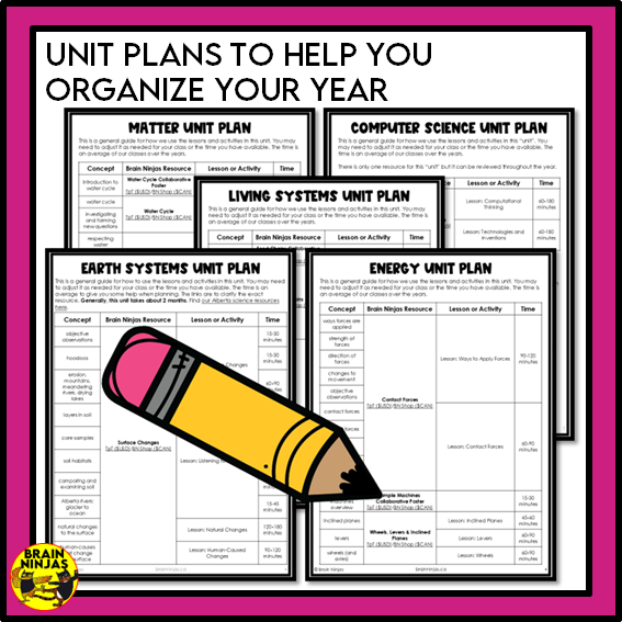 Get your full year of Alberta science for the new curriculum planned and ready to go in minutes. Complete lesson plans for matter, computer science, energy, earth systems and living systems are included with activities, experiments and projects. Best of all, you don't have to plan anything because we did it for you!