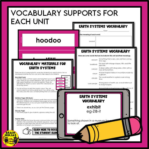 - a unit vocabulary list with pronunciations and definitions, word wall words, glossary, student glossary where students can write the definitions.