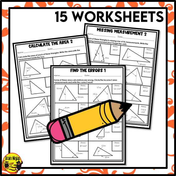 - 15 different pages to practice calculating the area of triangles when given the measurements in millimetres, centimetres, or metres. Students will find the missing measurement when given the area and another measurement, and they will determine if the area of a triangle is correct.