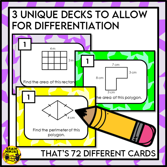 - Deck 2: 24 cards calculating the area of polygons (students can divide the shape into rectangles).