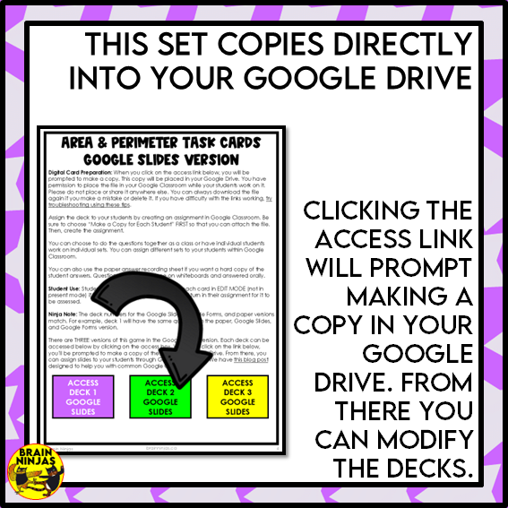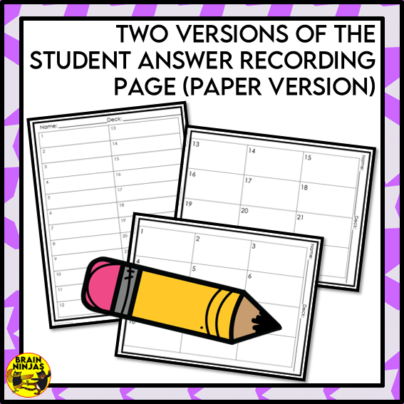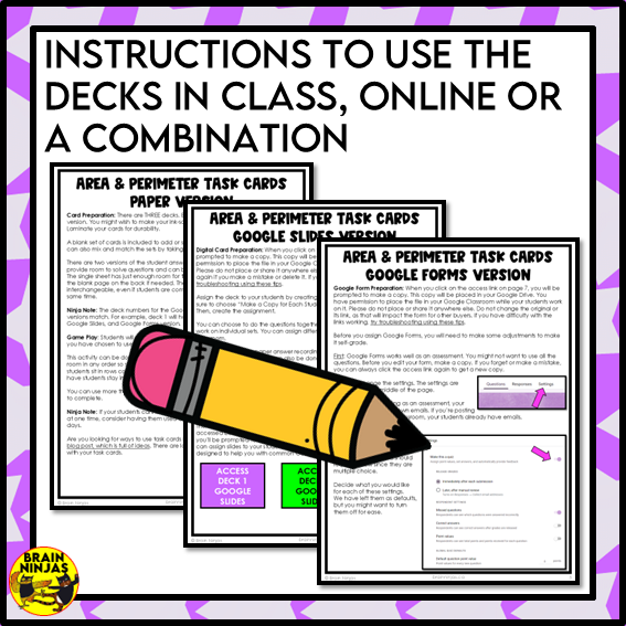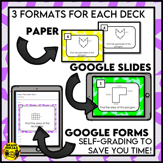- digital formats: Google Slides™ are interactive for online or blended classrooms or Google Forms™ in a quiz format for instant feedback and effortless marking.