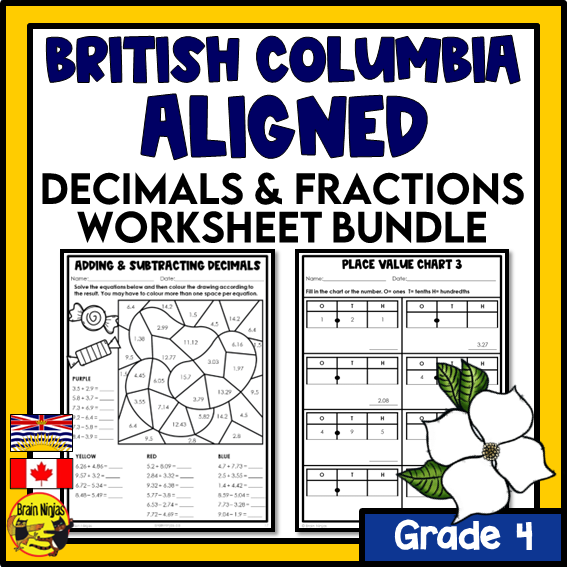 British Columbia Aligned Decimals and Fractions Math Worksheets Bundle | Paper | Grade 4