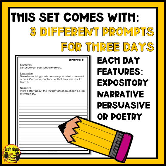 - three prompts for each of the three days (that's 9 prompts) that alternate between narrative, persuasive, expository, and poetry genres.