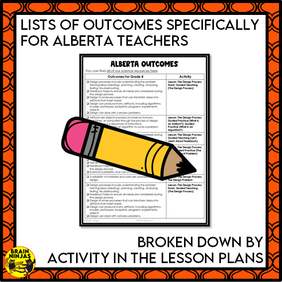 - an alignment guide for Alberta Outcomes listed by each activity in the lesson plan.