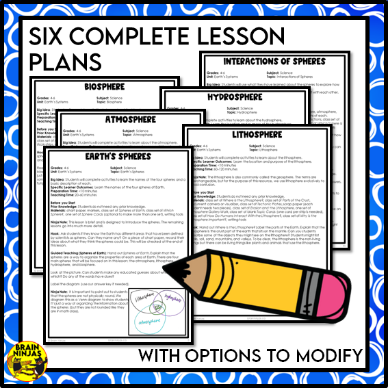Teach the Earth's spheres: lithosphere (geosphere), atmosphere, hydrosphere and biospheres. Learn about the interactions between the spheres and how organisms interact with each other. The best part of this resource is that you can plan, print and use it in minutes.
