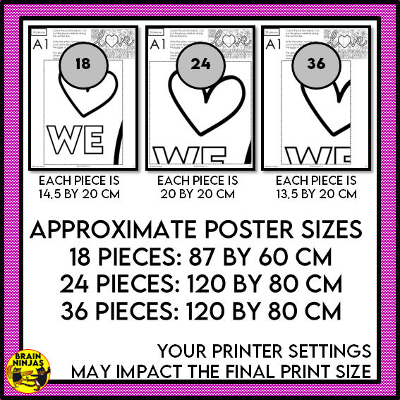 - a horizontally oriented poster. Final poster sizes depend on your printer settings, but the approximate sizes are 18 pieces: 87 by 60 cm; 24 pieces: 120 by 80 cm; 36 pieces: 120 by 80 cm.