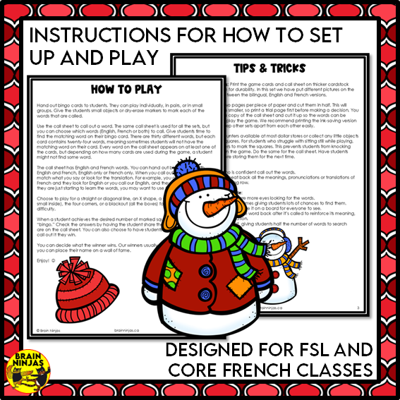 - Three sets of Bingo cards: English for beginner learners; French to immerse students in vocabulary practice Bilingual for a mix of English and French learning. Each set has 30 cards.