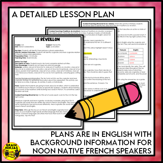- Step-by-step instructions to guide you through teaching Le Réveillon, even if you’re not fluent in French. The plans are written in English.