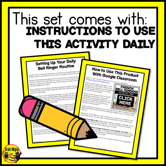 Explore French and learn about some of the reasons it works the way it does with this fun and engaging set of fifteen quick bell ringer activities. Use them to start each French class. No prep is needed and you can even leave these activities with your non-French-speaking substitute teacher.