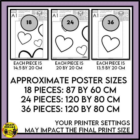 - a horizontally oriented poster. Final poster sizes depend on your printer settings, but the approximate sizes are 18 pieces: 87 by 60 cm; 24 pieces: 120 by 80 cm; 36 pieces: 120 by 80 cm.