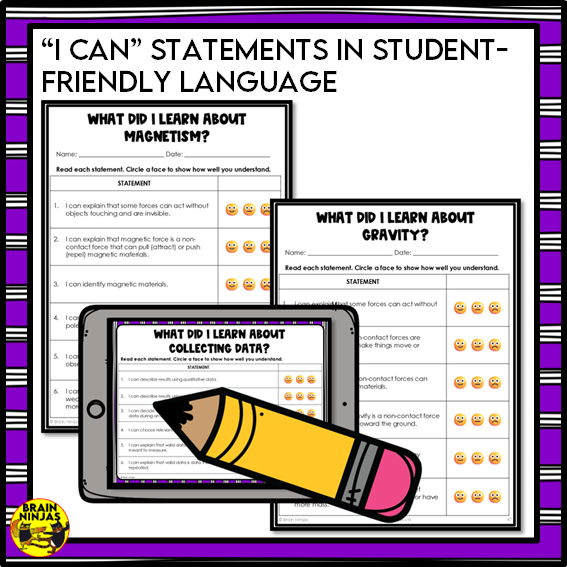 - "I can" statements in student-friendly language and format for students to self-assess their learning.