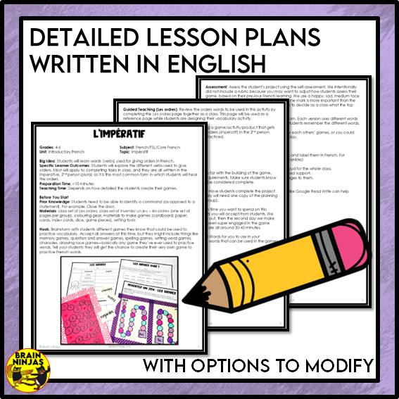 - a project where students design a game with French commands that can be played and created for practice. It include planning pages for students.