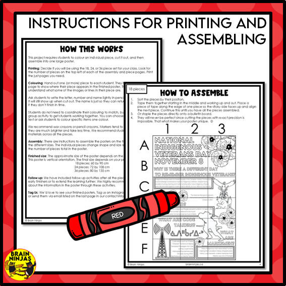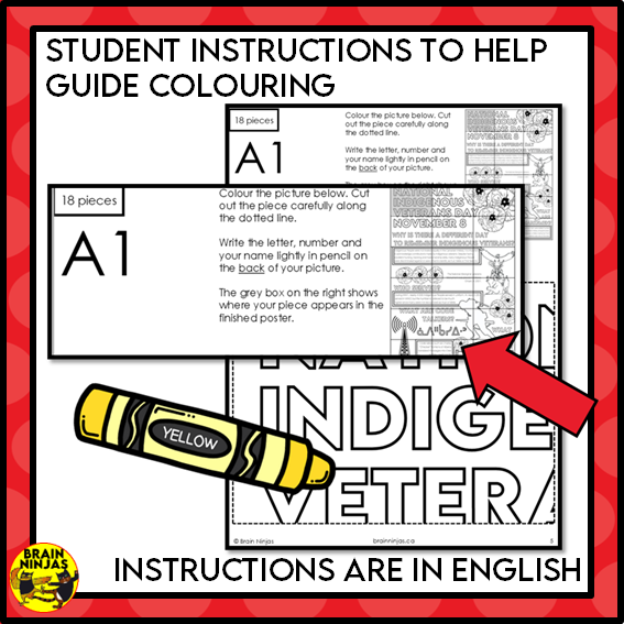 Use this collaborative poster with your class to start conversations about National Indigenous Veterans Day in Canada. This colouring activity takes your students 10-30 minutes and just requires printing for you to use right away. It's a great activity to use to calm the mood, learn about Indigenous veterans, or leave with a substitute teacher.