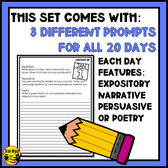 - three prompts for each of the twenty days (that's 60 prompts) that alternate between narrative, persuasive, expository and poetry genres. None of the prompts feature specific holidays.