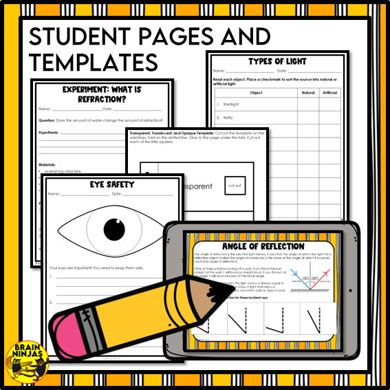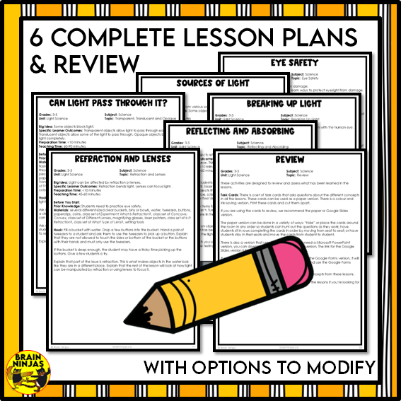 - lessons about eye safety, sources of light (natural and artificial light), transparency, opacity, translucency, shadows, breaking up light (light spectrum), reflection, angle of reflection, concave and convex lenses, optical devices, and refraction.