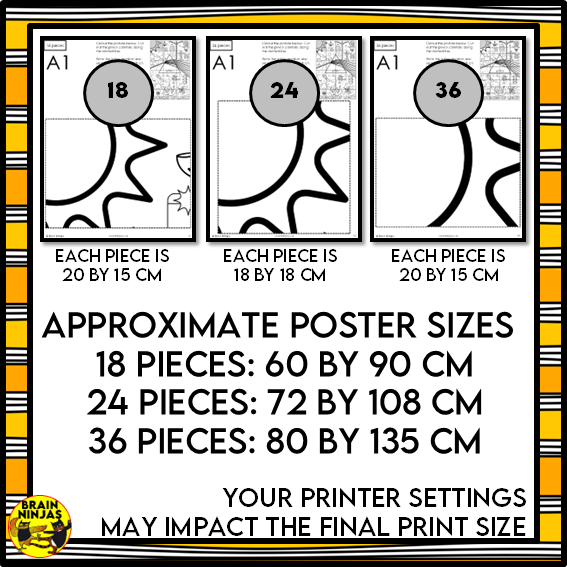 - a vertically oriented poster. Final poster sizes depend on your printer settings, but the approximate sizes are 18 pieces 60 by 90 cm, 24 pieces 72 by 108 cm and 36 pieces 80 by 135 cm.