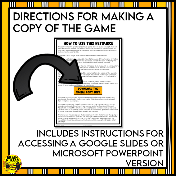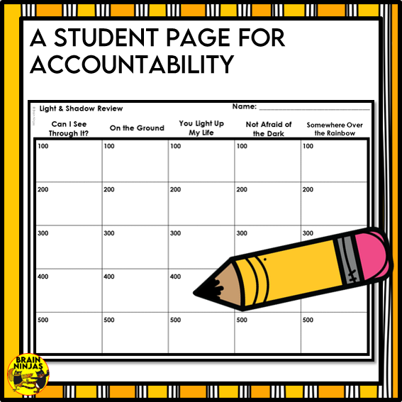 Review light energy concepts with your class with this no-prep game. It works as an introduction to your unit or as a quick activity before a unit test. You can even use the accountability page and have students record their answers as a quick assessment.