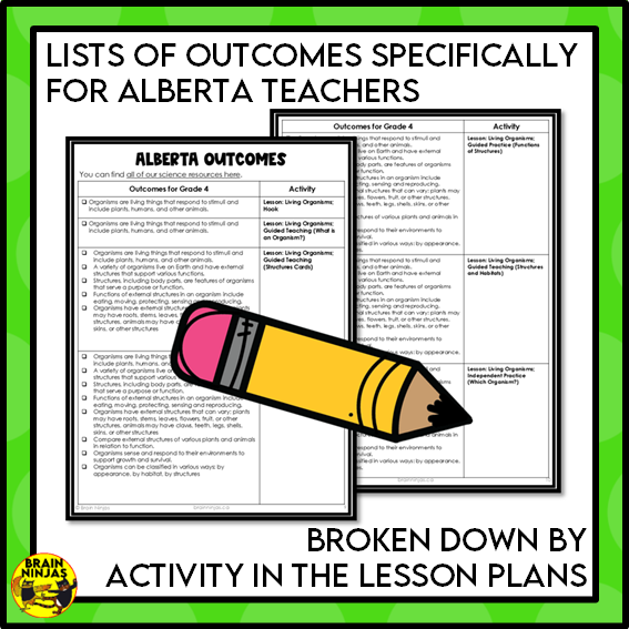 - an alignment guide for Alberta Outcomes listed by each activity in the lesson plan.