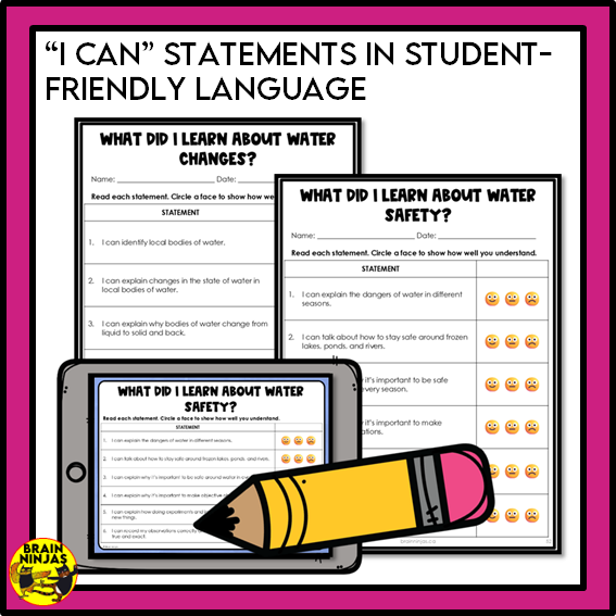 - "I can" statements in student-friendly language and format for students to self-assess their learning in each lesson.