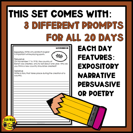 - three prompts for each of the twenty days (that's 60 prompts) that alternate between narrative, persuasive, expository and poetry genres. None of the prompts feature specific holidays.
