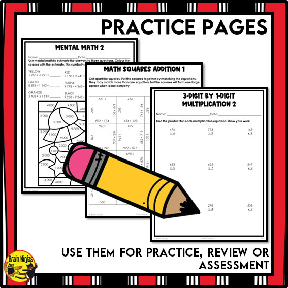 - practice pages (worksheets) to help practice the concepts or to use for formative assessment.