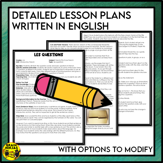 - a complete lesson plan that includes reading, writing, listening and speaking activities written in English to practice posing questions in French. Instructions for how to modify the lessons are included.