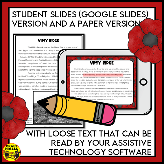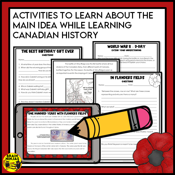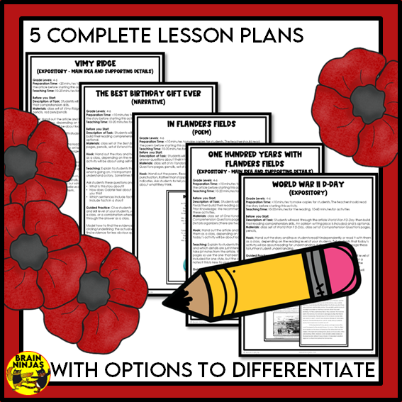 Use these reading and writing lessons to check for reading comprehension, teach note-taking and researching while exploring topics including Vimy Ridge, D-Day, The War in Afghanistan, and Flanders Fields from a Canadian perspective.