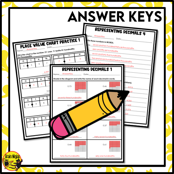 - 15 different pages about representing decimals and practicing place value up to the thousandths place.