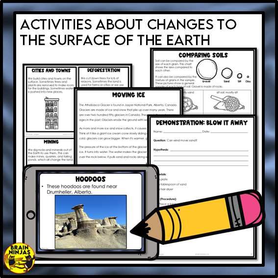 - natural surface changes: volcanic activity, earthquakes, erosion, weather, glaciers, flooding, meteorites, landslides, plants and animals.
