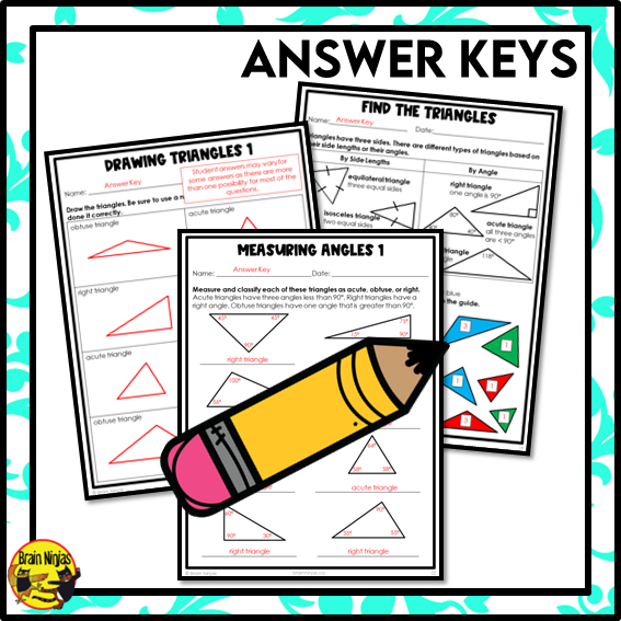 - 15 different pages about identifying equilateral, isosceles or scalene triangles by using side lengths or acute, obtuse, or right triangles using angle measurements. Students need to be able to use a protractor for some of these activities.