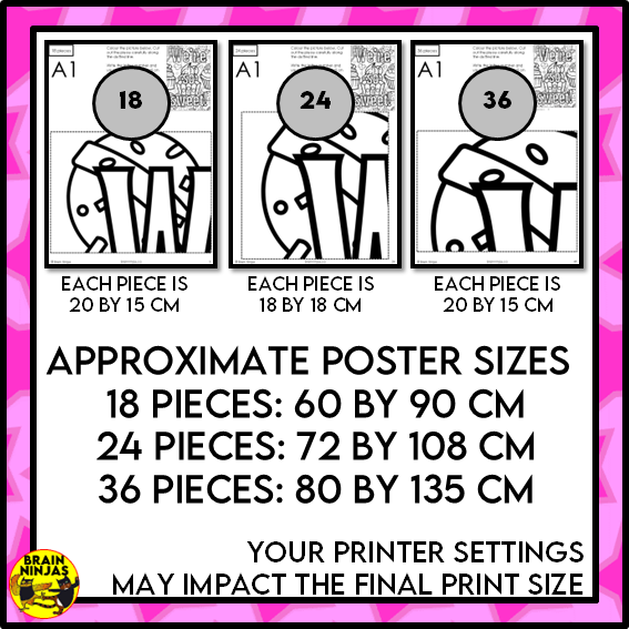 - a vertically oriented poster. Final poster sizes depend on your printer settings, but the approximate sizes are 18 pieces 60 by 90 cm, 24 pieces 72 by 108 cm and 36 pieces 80 by 135 cm.
