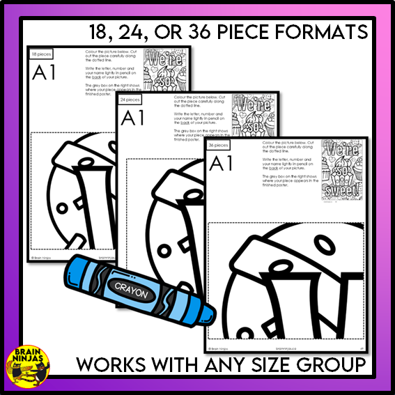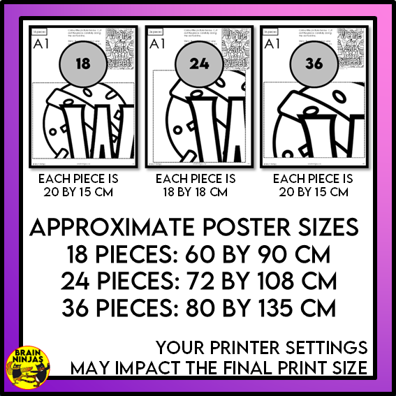 - a vertically oriented poster. Final poster sizes depend on your printer settings, but the approximate sizes are 18 pieces 60 by 90 cm, 24 pieces 72 by 108 cm and 36 pieces 80 by 135 cm.