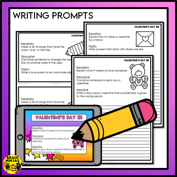- three prompts for each of the ten days (that's 30 prompts) that alternate between narrative, persuasive, expository and poetry genres. All of the prompts fit with a Valentine's Day theme.