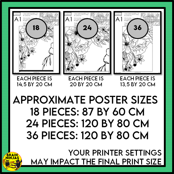 - a horizontally oriented poster. Final poster sizes depend on your printer settings, but the approximate sizes are 18 pieces: 87 by 60 cm; 24 pieces: 120 by 80 cm; 36 pieces: 120 by 80 cm.