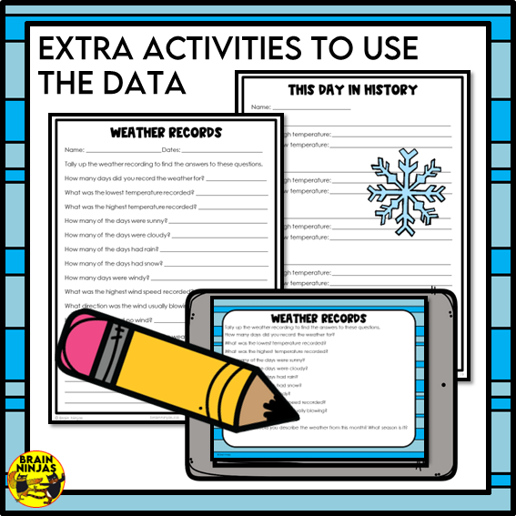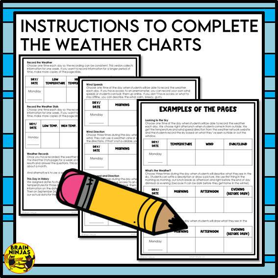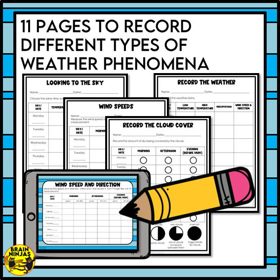 - 11 different weather recording charts which measure different factors like temperature, cloud cover, wind and precipitation.