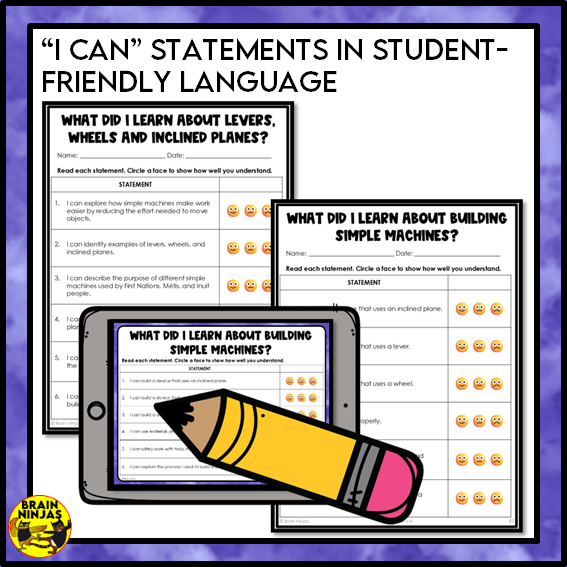 - "I can" statements in student-friendly language and format for students to self-assess their learning.